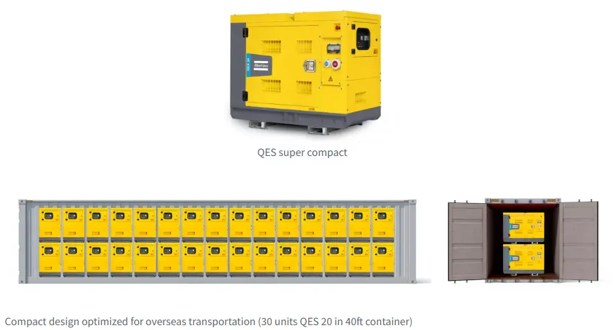 QES modelo super trinko berritzailea garraio eraginkorrena emateko diseinatuta dago. Atlas Copco QES 20 30 unitate sar ditzakezu 40 oineko edukiontzi batean, gehien merkatuan dagoen 20 kVA-ko Atlas Generator batentzat! Garraio optimizatua, CO2 isuriak eta kostu operatiboak murriztea esan nahi du, eta horrek jabetza-kostu totala (TCO) txikiagoa dakar. Ingurumena errespetatzen duen diseinuari esker, atzerrian biltegiratzeko aproposa da, tokian tokiko aztarna esponentzialki murriztuz.