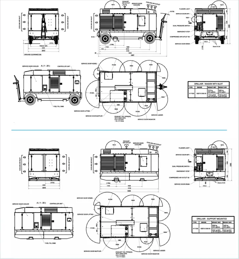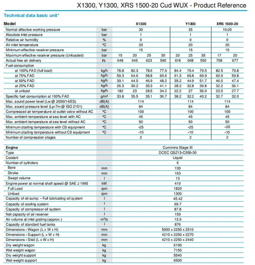 Atlas Copco X1300, Y1300 eta XRS 1500-20 isilduak dira, bi etapako, olioz injektatutako torloju-konpresoreak, likido hoztutako sei zilindroko Cummins diesel motorrak elikatzen direnak.
