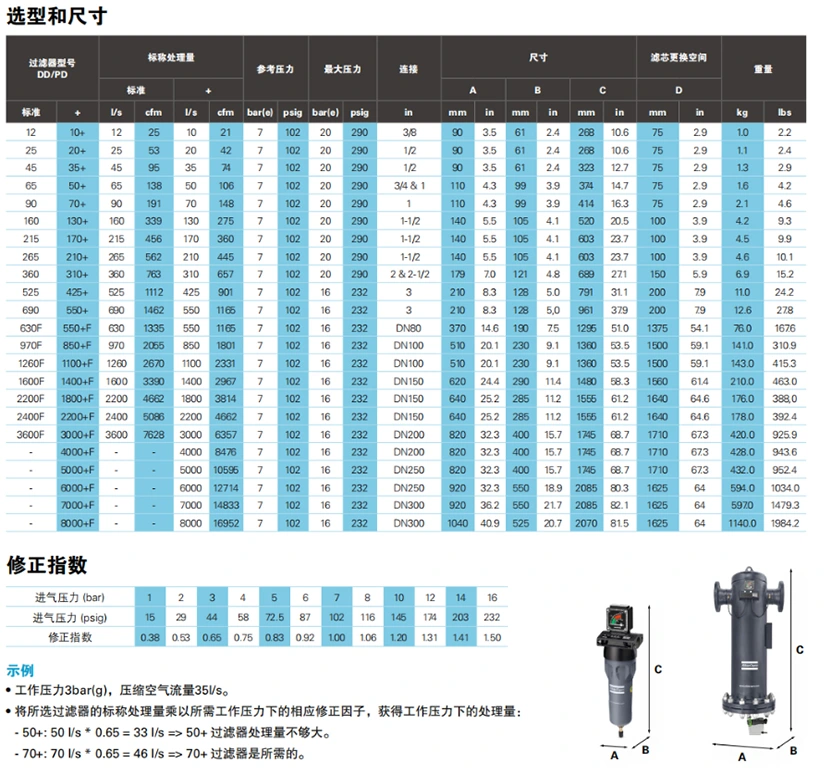 Taula honek aire konprimituko iragazkien serieei eta haien aplikazio orokorrei buruzko informazioa eskaintzen du.