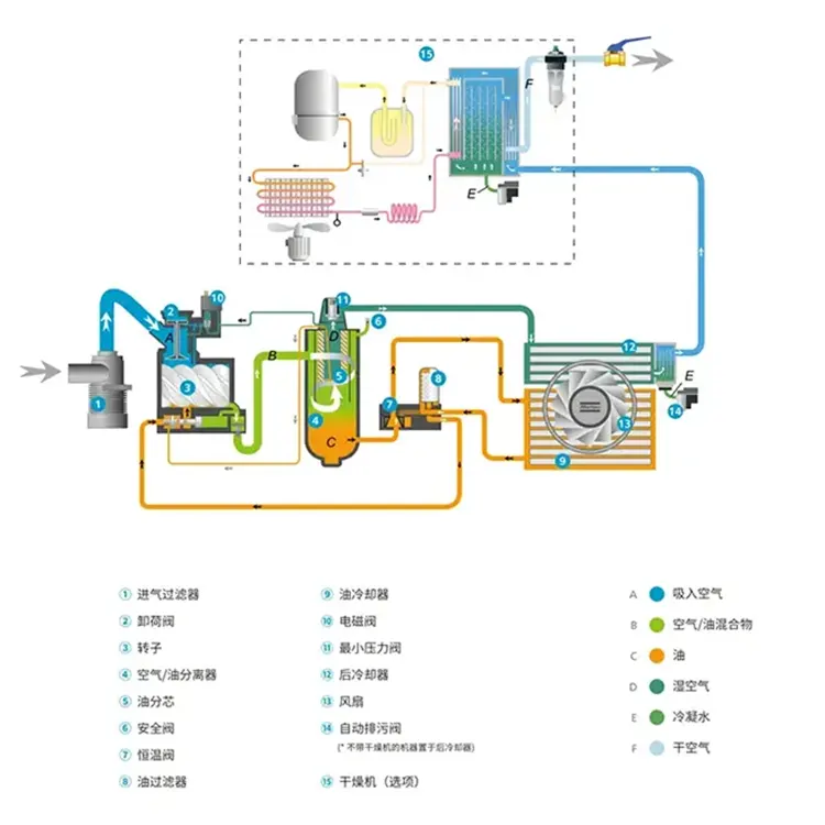 1. Hasierako fasea: pizteko botoia sakatzen denean, kontrol-sistema elektronikoak automatikoki abiaraziko ditu aire-konpresorearen lubrifikazio-sistema eta hozte-ur-sistema. Aldi berean, sarrerako balbula irekitzen da eta airea unitate nagusiaren barnean sartzen da.
