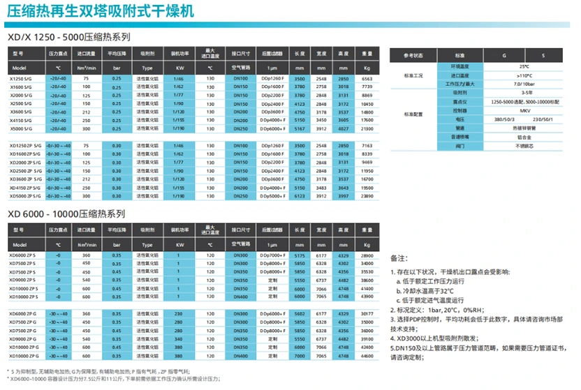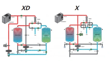 XD edo X konpresio-bero-adsortzio-lehorgailuek kalitate handiko xurgatzaileak erabiltzen dituzte eta oliorik gabeko konpresorearen konpresio-beroa eraginkortasunez erabiltzen dute xurgatzailea birsortzeko, energia-kontsumoa eta mantentze-kostuak nabarmen murriztuz.
