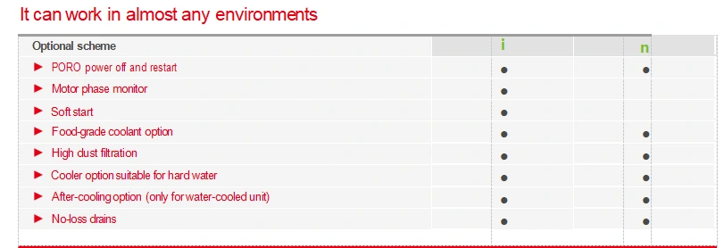 Gure konpresoreek elikagai-mailako hozgarriak, hauts-iragazte handiko eta ur gogor-hozgailuak eta ingurune gogorretara egokitutako beste aukera batzuk eskaintzen dituzte, zure aplikazio-beharrizanak ase ditzaketenak.