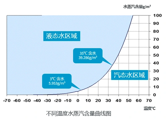 Irudiak erakusten du aireak ur-lurrun kantitate desberdinak edukitzen dituela tenperatura desberdinetan. Airea hozten da, eta ur-lurrunaren maila ere jaisten da. Kurbak ur-lurrun saturatuen mailak markatzen dituzten puntuak ditu. Puntu horietako bakoitzaren tenperatura ihintz-puntua da. Ihintz-puntu baxuago batek ur-lurrun gutxiago esan nahi du aire konprimituan. Aire lehorgailu hozkailuek arau fisiko hau erabiltzen dute. Aire konprimituari beroa hozgarriarekin trukatzen uzten diote. Ekintza honek aire konprimituaren tenperatura jaisten du. Hoztutako airearen ur-lurruna ur likido bihurtzen da. Likido hori sistematik kanpora ateratzen da. Adibidez, aire konprimituaren ur-lurrun saturatua 35 ℃-tan 39,286 g/m³ da. Hozgarriarekin bero trukatu eta 3 ℃-ra hoztu ondoren, ur-lurrun asearen edukia 5,953 g/m³ da. 33,333 g/m³-ko diferentziak izozgailuak hoztu eta deshidratatu ondoren kendutako ur kopurua adierazten du. Hau da, aire konprimitua izozgailutik igaro ondoren, hezetasunaren %85 gutxi gorabehera kentzen da, aire konprimituaren lehorketak produkzio-prozesuaren baldintzak betetzen dituela ziurtatuz.