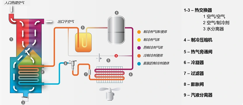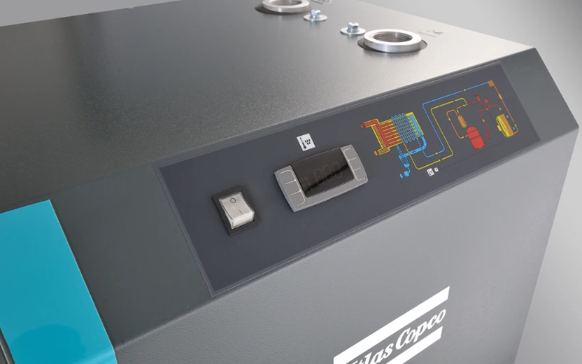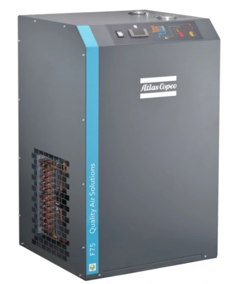 Atlas Copco F-motako aire-lehorgailu hozkailuak hiru batean bero-trukagailu bat erabiltzen du, aire/airea, airea/hozgarria eta ur bereizleak konbinatzen dituena. Honek hoztu ondoren bereizitako ur likidoa eraginkortasunez kentzen du eta aire konprimitua aurrez hozten du, bero-trukearen eraginkortasuna hobetuz. Aldi berean, deshidratatutako aire konprimitua sarrerako tenperatura baino 10 °C baxuagora berotzen du, tratamenduaren ondoren aire konprimituaren hezetasun erlatiboa % 50etik beherakoa dela ziurtatuz, korrosioa saihestuz eta hoztutako aire lehorgailuaren benetako deshidratazio-efektua lortuz.