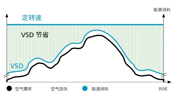Konpresoreen energia-kontsumoa bizi-ziklo osoaren kostuaren % 70 baino gehiago da, eta aire konprimituaren ekoizpenak zentralaren elektrizitate-faktura osoaren % 40 baino gehiago kontsumitzen du. Energia-kontsumoa murrizteko, Atlas Copcok VSD Oil-Free Water-Lubricated Air Compressor garatu zuen. Atlas Copco-k abiadura aldakorreko (VSD) aire-konpresoreen aukera zabala eskaintzen du merkatuan.